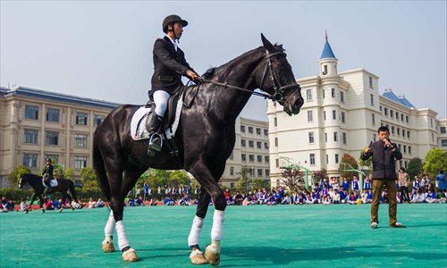 A horse and its rider perform in front of students in the playground of Wenzhou No.2 Foreign Language School in Zhejiang Province Wednesday. Students also learned knowledge about equestrianism. Photo: CFP