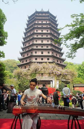 An artist performs gu zheng, a traditional Chinese zither, at Liuhe Pagoda in Hangzhou, Zhejiang Province on Thursday. The tower reopened to tourists after a year of renovation.