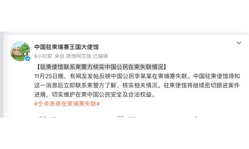 The Chinee embassy in Cambodia contacted Cambodian police to verify the situation of a missing Chinese national in Cambodia, after social media posts on Sina Weibo said the person had been missing in Cambodia.