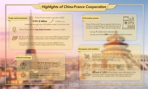 GTGraphic: Highlights of China-France Cooperation -Trade in goods in 2022 reached €101.8 bln, up 14.6% y-o-y -China will fly French experiments on Chang'e 6 mission -20% of Airbus aircraft were delivered to China during pandemic