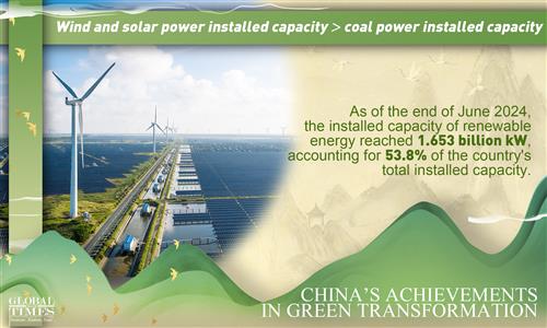China is making big strides in green transformation. The combined installed capacity of wind and solar power has surpassed that of its coal power for the first time as of the end of June 2024. Check out the graphic to learn more: