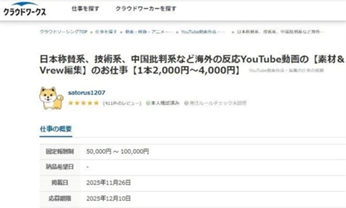 Japan's crowdsourcing platform CloudWorks took down a recruitment post on Wednesday that sought creators for "YouTube videos on overseas reactions that praise Japan and criticize China," Japanese media outlet J-Cast reported.