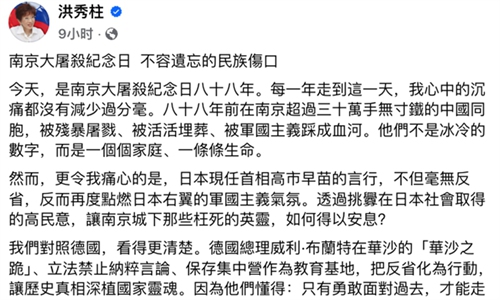 Hung Hsiu-chu, former chairperson of the Chinese Kuomintang (KMT) party, on Saturday posted a message on Facebook to mark the 88th anniversary of the Nanjing Massacre, in which she strongly criticized Japan. December 13, 2025 marks China's 12th National Memorial ...