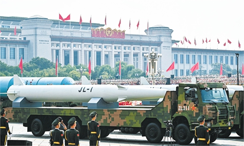 In response to the world's attention to the nuclear missile formation at China's V-Day military parade on September 3, consisting of JL-1 air-launched long-range missile, JL-3 submarine-launched intercontinental missile, as well as DF-61 and DF-31BJ land-based intercontinental missiles, Cheng Jingye, head of China's Arms Control and Disarmament Association, said on Wednesday that China's nuclear policy has been consistent, guided by the goal of protecting national security, territorial integrity and independence.