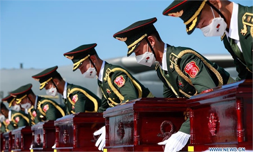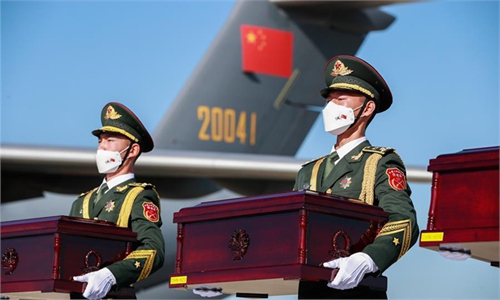 Transported via China's domestically developed strategic cargo plane Y-20, which was greeted by arcing jets of water as it taxied to a halt at Taoxian international airport in Shenyang, capital of Northeast China's Liaoning Province, the remains of 117 Chinese soldiers killed in the War to Resist US Aggression and Aid Korea (1950-53) returned home on Sunday, reflecting the country's unprecedented respect for its martyrs.