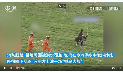 In a heartwarming display of teamwork and bravery, firefighters and police officers in Northwest China's Xinjiang Uygur Autonomous Region rushed to the aid of an ostrich farm that was being battered by a flash flooding on May 13.