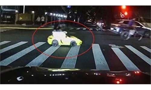On June 15, a shocking scene unfolded at a busy intersection in downtown Shanghai, with two adults and a child, suspected to be a family of three, riding a toy electric car and crossing a zebra crossing on a busy road.