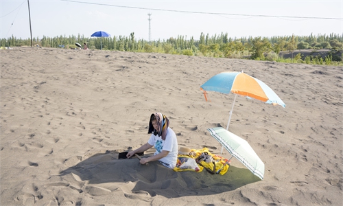 Visitors flock to enjoy sand therapy in Turpan City in Northwest China's Xinjiang, which is known for its scorching heat, as the city has recently seen surface temperatures surging to as high as 80 C at the Flaming Mountain scenic area.