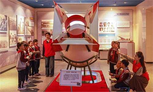 Teachers and students visit a miniature model of China's first atomic bomb at the Guo Yonghuai Memorial Hall in Rongcheng, Shandong Province, on October 16, 2024. A pioneer of modern Chinese mechanics, Guo made significant contributions to mechanics, applied mathematics, and aeronautics.