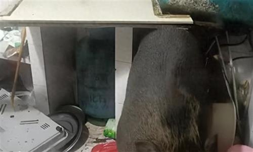 In a bizarre incident in Nanjing, East China's Jiangsu Province, a wild boar weighing over 300 pounds crashed through the ceiling of a residence and rampaged through the kitchen.