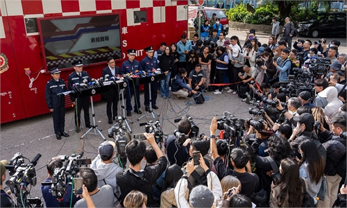 Regarding the fire that broke out at Wang Fuk Court, Tai Po in the Hong Kong Special Administrative Region (HKSAR) and resulted in at least 13 fatalities and 28 injuries, the HKSAR Chief Executive John Lee said on Wednesday that “I am deeply saddened and extend my heartfelt condolences to the families of the deceased and those injured," adding that multiple departments are fully committed to firefighting, rescue operations, and medical treatment, according to a statement sent to the Global Times.