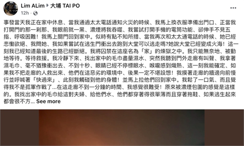 A total of 144 individuals previously listed as missing in the Tai Po Wang Fuk Court fire have been confirmed safe, the Hong Kong Special Administrative Region (HKSAR) government announced at a press conference on Saturday afternoon. The firefighting and rescue operations at Wang Fuk Court have been completed on Friday. On the same day, a fire survivor surnamed Lim at this residential compound posted a long story on social media, providing a gripping first-person account of moments between life or death. His testimony offers netizens a rare and visceral look into the chaos, fear and helplessness that residents experienced during this devastating fire that had caused at least 128 death as of Saturday afternoon.