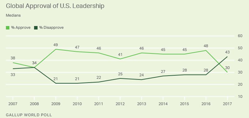 The survey, conducted by American consulting company Gallup, found that approval of U.S. leadership in more than 130 countries had dropped to 30 percent in 2017, the lowest since the company began annually tracking the measure a decade ago.