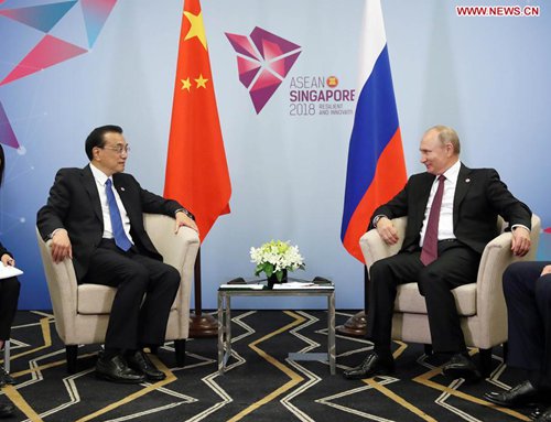 Chinese Premier Li Keqiang meets with Russian President Vladimir Putin in Singapore, on Nov. 15, 2018. (Xinhua/Liu Weibing)