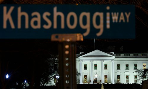 A protest sign reading "Khashoggi way" is seen across the street from the White House in Washington, DC on Sunday. Jamal Khashoggi, a Saudi contributor to The Washington Post, was killed on October 2 shortly after entering the kingdom's consulate in Istanbul, Turkey in what Riyadh called a "rogue" operation. Photo: VCG