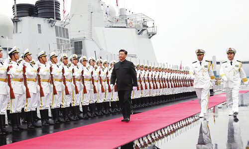 Chinese President Xi Jinping, also general secretary of the Communist Party of China Central Committee and chairman of the Central Military Commission, reviews a naval guard of honor during an event to celebrate the Chinese People's Liberation Army Navy's 70th anniversary in Qingdao, East China's Shandong Province on Tuesday. Photo: Xinhua