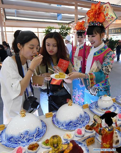 Visitors taste traditional Beijing snacks during the Asian Cuisine Festival at the Olympic Park in Beijing, capital of China, May 16, 2019. The week-long Asian Cuisine Festival, as part of the Conference on Dialogue of Asian Civilizations (CDAC), was held in four cities of Beijing, Hangzhou, Chengdu and Guangzhou. (Xinhua/Wang Yuguo)