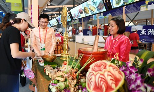 Visitors view Thai food during the Asian Cuisine Festival at the Olympic Park in Beijing, capital of China, May 16, 2019. The week-long Asian Cuisine Festival, as part of the Conference on Dialogue of Asian Civilizations (CDAC), was held in four cities of Beijing, Hangzhou, Chengdu and Guangzhou. (Xinhua/Zhang Chenlin)