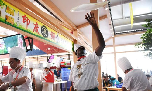 A chef makes Indian food during the Asian Cuisine Festival at the Olympic Park in Beijing, capital of China, May 16, 2019. The week-long Asian Cuisine Festival, as part of the Conference on Dialogue of Asian Civilizations (CDAC), was held in four cities of Beijing, Hangzhou, Chengdu and Guangzhou. (Xinhua/Zhang Chenlin)