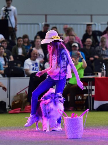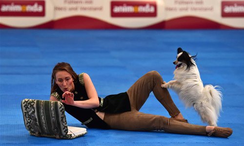 A girl and her dog perform during the Hund and Katz exhibition in Dortmund, Germany, on May 19, 2019. The three-day event hosted by German Kennel Club, presents dogs and cats of more than 200 breeds from around the world. (Photo: Xinhua)