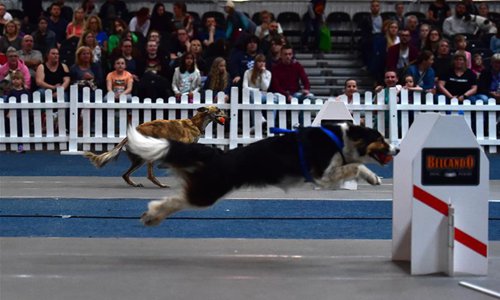 Dogs are seen in the "Flyball" competition during the Hund and Katz exhibition in Dortmund, Germany, on May 19, 2019. The three-day event hosted by German Kennel Club, presents dogs and cats of more than 200 breeds from around the world. (Photo: Xinhua)