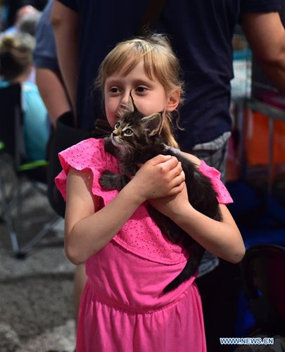 A girl interacts with a little Maine Cat during the Hund and Katz exhibition in Dortmund, Germany, on May 19, 2019. The three-day event hosted by German Kennel Club, presents dogs and cats of more than 200 breeds from around the world. (Photo: Xinhua)