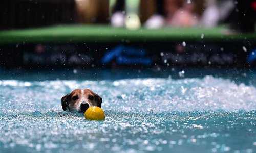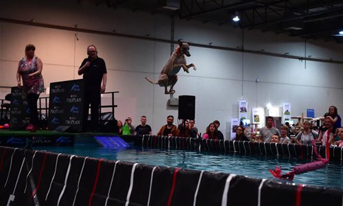 A hound is seen in the "Diving Dog" competition during the Hund and Katz exhibition in Dortmund, Germany, on May 19, 2019. The three-day event hosted by German Kennel Club, presents dogs and cats of more than 200 breeds from around the world. (Photo: Xinhua)