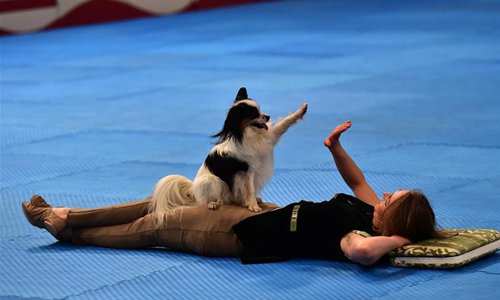 Cora Czermak from Germany attends the "Dog Dancing" competition with her dog Steps, a Papillon, during the Hund and Katz exhibition in Dortmund, Germany, on May 19, 2019. The three-day event hosted by German Kennel Club, presents dogs and cats of more than 200 breeds from around the world. (Photo: Xinhua)