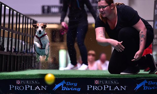 A Jack Russell Terrier is seen in the "Diving Dog" competition during the Hund and Katz exhibition in Dortmund, Germany, on May 19, 2019. The three-day event hosted by German Kennel Club, presents dogs and cats of more than 200 breeds from around the world. (Photo: Xinhua)