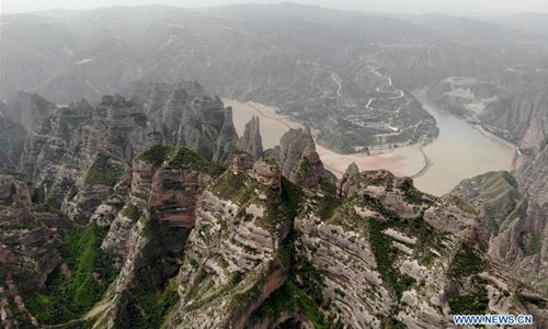 Aerial photo taken on May 19, 2019 shows a stone forest at Bingling Danxia National Geological Park in Yongjing County, northwest China's Gansu Province. Danxia landform is a unique type of landscapes formed from red sandstone and characterized by steep cliffs. (Photo: Xinhua)