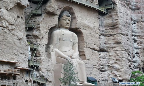 A buddhist statue is shown in the photo taken on May 18, 2019 at Bingling Danxia National Geological Park in Yongjing County, northwest China's Gansu Province. Danxia landform is a unique type of landscapes formed from red sandstone and characterized by steep cliffs. (Photo: Xinhua)