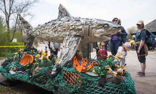 People look at the art installation "Flash the Marlin" during the exhibition "Washed Ashore: Art to Save the Sea" at the Toronto Zoo in Toronto, Canada, May 19, 2019. Kicked off over the weekend, the six-month-long unique exhibition was aimed at warning of the negative and devastating effects of plastic pollution, sparking positive changes in consumer habits. All the art installations were built completely with plastics collected from oceans and waterways around the world. (Xinhua/Zou Zheng)
