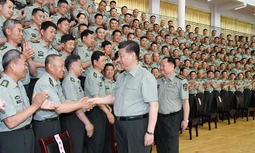 Chinese President Xi Jinping, also general secretary of the Communist Party of China Central Committee and chairman of the Central Military Commission, meets with military officers and experts at the Army Infantry College of the People's Liberation Army in east China's Jiangxi Province. Xi inspected the Army Infantry College of the People's Liberation Army in east China's Jiangxi Province Tuesday. (Photo: Xinhua)