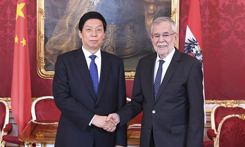 Li Zhanshu (L), chairman of the Standing Committee of the National People's Congress (NPC), meets with Austrian President Alexander Van der Bellen in Vienna, Austria, on May 20, 2019. China's top legislator Li Zhanshu paid an official friendly visit from May 18 to 21 to Austria, where he met with Austrian leaders on promoting bilateral ties and expressed China's stance on upholding multilateralism and free trade. (Photo: Xinhua)
