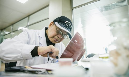 Chinese ceramics repair expert, Wang Mian, repairs a red glaze bowl used in the Qing Dynasty (1644-1911). Photo: Li Hao/GT