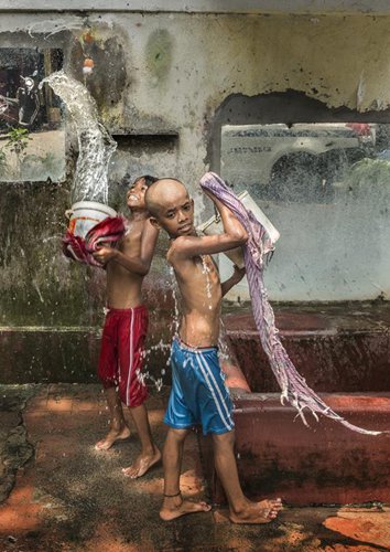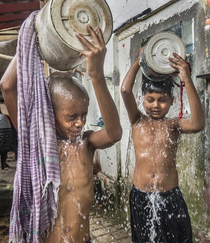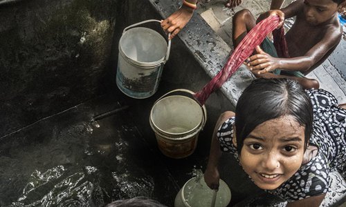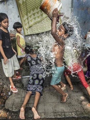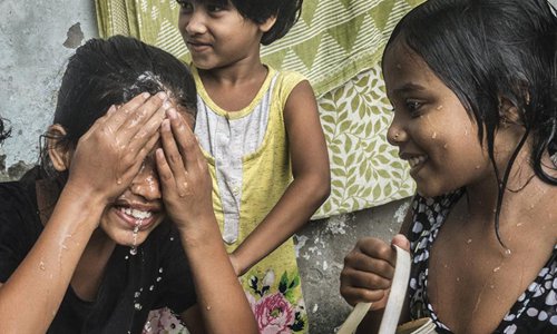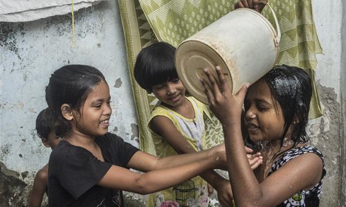 Indian children cool themselves at a slum area in a hot summer afternoon in Kolkata, India on May 22, 2019. (Photo: Xinhua)