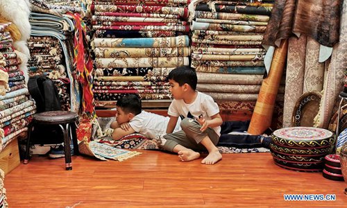 Two children are seen at a carpet shop at the Xinjiang International Grand Bazaar in Urumqi, northwest China's Xinjiang Uygur Autonomous Region, May 22, 2019. (Photo: Xinhua)