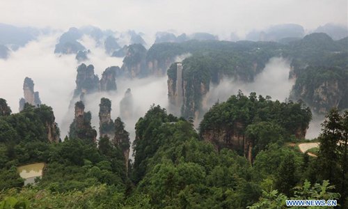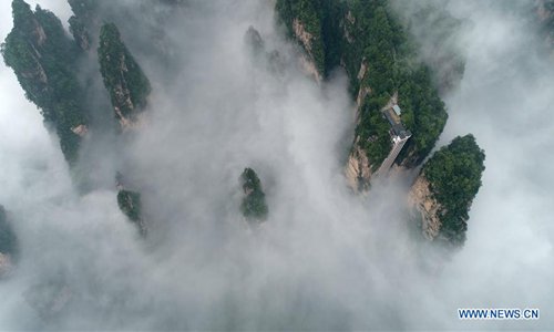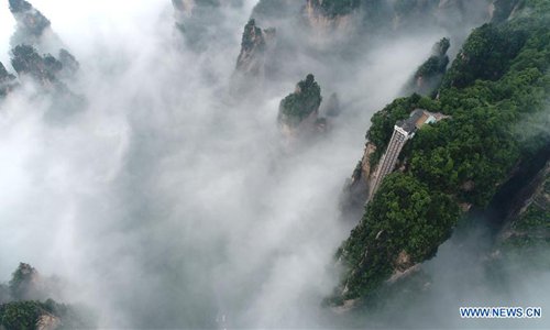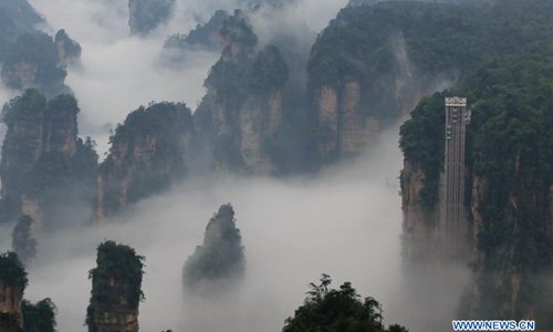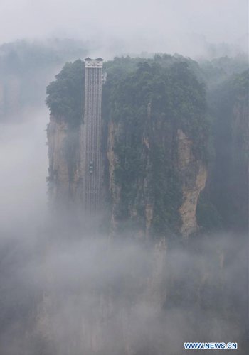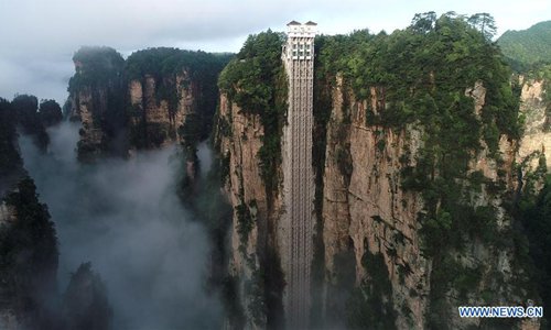 Photo taken on May 25, 2019 shows the 326-meter-high Bailong Elevator, the world's highest outdoor elevator, shrouded by fog at the Wulingyuan Scenic Area in Zhangjiajie, central China's Hunan Province. Photo: Xinhua