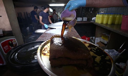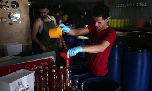 Palestinian vendors work inside a shop to sell juices that people usually drink during the holy month of Ramadan in the West Bank city of Nablus, May 28, 2019. (Xinhua/Ayman Nobani)