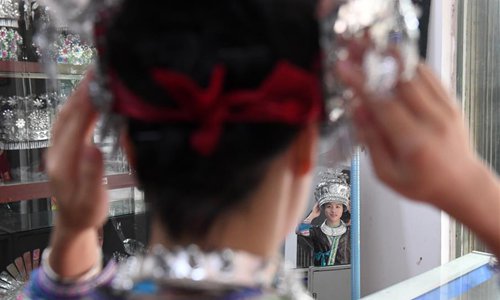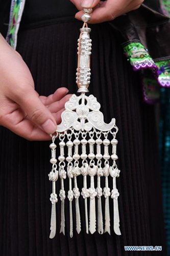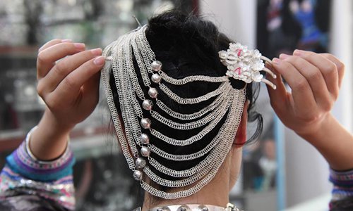 A woman tries Miao ethnic silver ornaments in Rongshui Miao Autonomous County, south China's Guangxi Zhuang Autonomous Region, May 29, 2019. Local women like to wear fancy silver ornaments to decorate themselves. (Xinhua/Lu Boan)