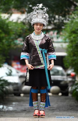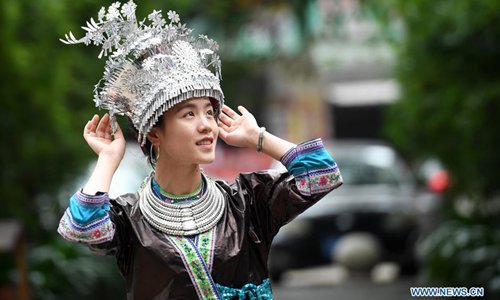Photo taken on May 29, 2019 shows a woman of Miao ethnic group wearing silver ornaments in Rongshui Miao Autonomous County, south China's Guangxi Zhuang Autonomous Region. Local women like to wear fancy silver ornaments to decorate themselves. (Xinhua/Lu Boan)