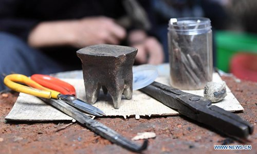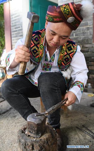 Handicraftsman Chen Zhiyuan works on his Miao ethnic silver ornament in Rongshui Miao Autonomous County, south China's Guangxi Zhuang Autonomous Region, May 29, 2019. Local women like to wear fancy silver ornaments to decorate themselves. (Xinhua/Lu Boan)
