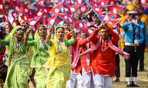 Nepalese dance in traditional attire during the 12th Republic Day parade in Kathmandu, on Wednesday. A special procession was organized, in which various cultural activities took place followed by parades of security forces and civil organizations. Photo: AFP