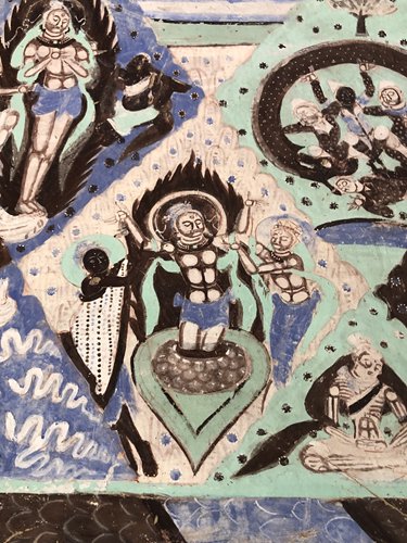 Palida explained that this wall painting tells the story of 500 merchants who became accidentally trapped in a dark valley. After growing increasingly anxious about being robbed in the dark, the head of the merchants wrapped his two arms in felt, dipped them in oil and lit them. He raised his arms high to guide the group in the darkness. After seven days and nights of walking, the group finally got out of the valley.
