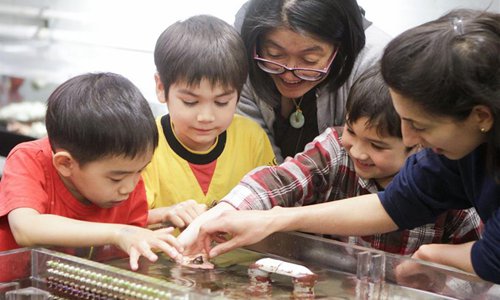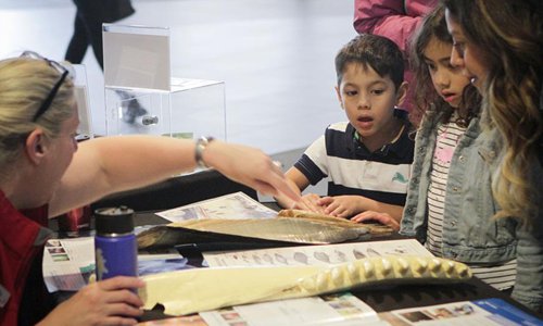 Children learn about different types of bones from the ocean mammals during the World Oceans Day event at Vancouver Aquarium in Vancouver, Canada, June 8, 2019. Thousands of people visited Vancouver Aquarium and participated in different aquatic-themed activities to mark the World Oceans Day. (Xinhua/Liang Sen)