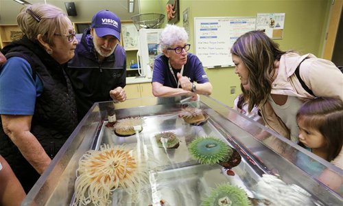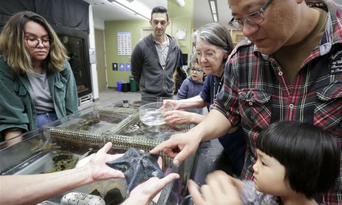 People view water creatures in the aquarium's laboratory during the World Oceans Day event at Vancouver Aquarium in Vancouver, Canada, June 8, 2019. Thousands of people visited Vancouver Aquarium and participated in different aquatic-themed activities to mark the World Oceans Day. (Xinhua/Liang Sen)