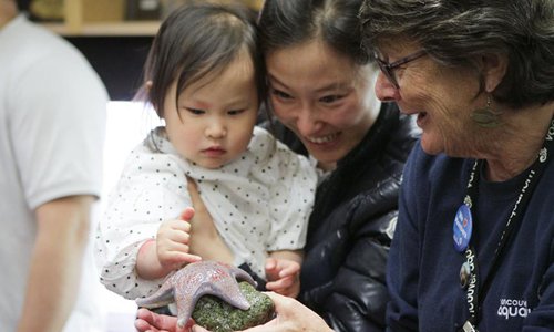 A girl tries to feel the surface of a sea star in the aquarium's laboratory during the World Oceans Day event at Vancouver Aquarium in Vancouver, Canada, June 8, 2019. Thousands of people visited Vancouver Aquarium and participated in different aquatic-themed activities to mark the World Oceans Day. (Xinhua/Liang Sen)