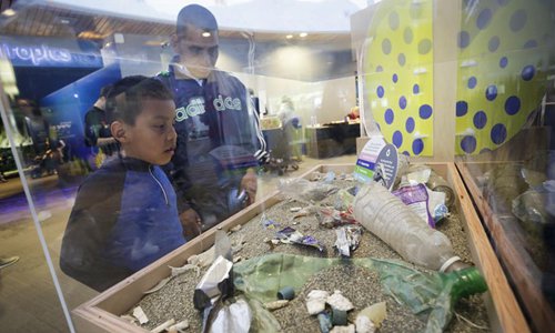 A visitor views a tank displaying the plastic waste which is hazardous to the ocean during the World Oceans Day event at Vancouver Aquarium in Vancouver, Canada, June 8, 2019. Thousands of people visited Vancouver Aquarium and participated in different aquatic-themed activities to mark the World Oceans Day. (Xinhua/Liang Sen)