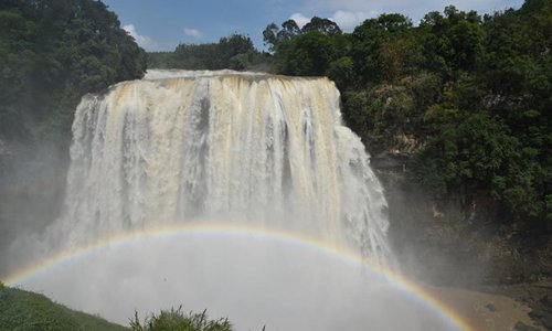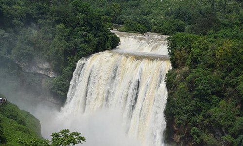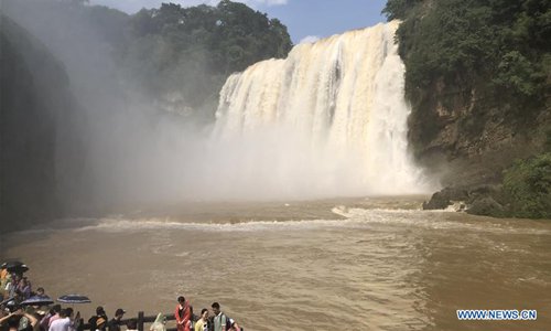 Tourists visit the Huangguoshu waterfall in Anshun, southwest China's Guizhou Province, June 8, 2019. The waterfall has entered high flow season due to continuous rainfall. (Xinhua/Jiang Cheng)
