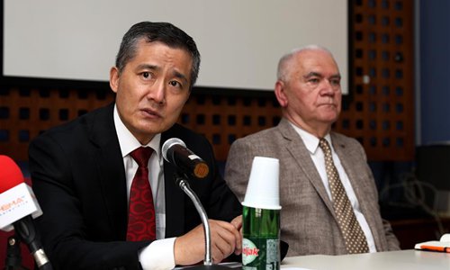 Ji Ping (L), Chinese Ambassador to Bosnia and Herzegovina (BiH), speaks during the meeting "Experiences from China's Development and Prosperity" in Sarajevo, capital of Bosnia and Herzegovina (BiH), on June 9, 2019. China contributes to the economic development of Bosnia and Herzegovina (BiH), participants pointed out during the meeting of BiH's intellectuals here on Sunday. (Photo: Xinhua)